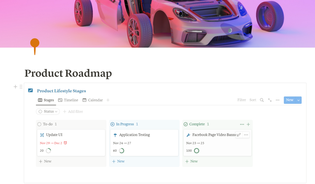 The Timeline (horizontal scrolling) and Calendar view of the Product Stages Database are the perfect way to keep On-Track and stay fully transparent with your Team for Product Development & Marketing/Sales!